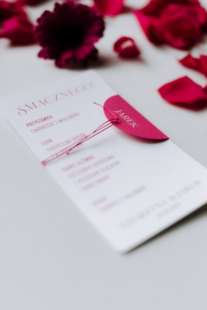 Menu weselne – informuje o daniach, ale też pięknie uzupełnia wystrój stołu. Jeśli masz określony motyw lub kolor przewodni – menu to świetny sposób, aby to podkreślić.